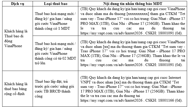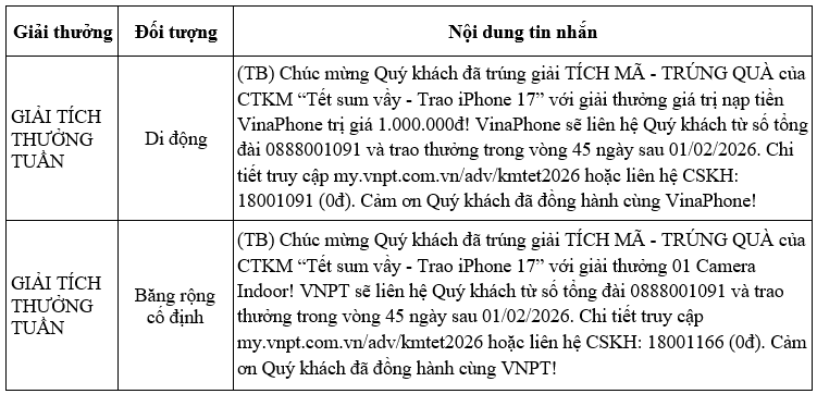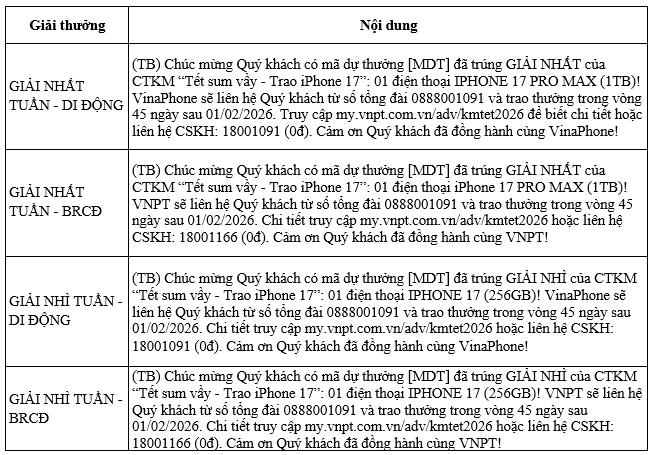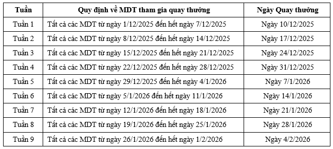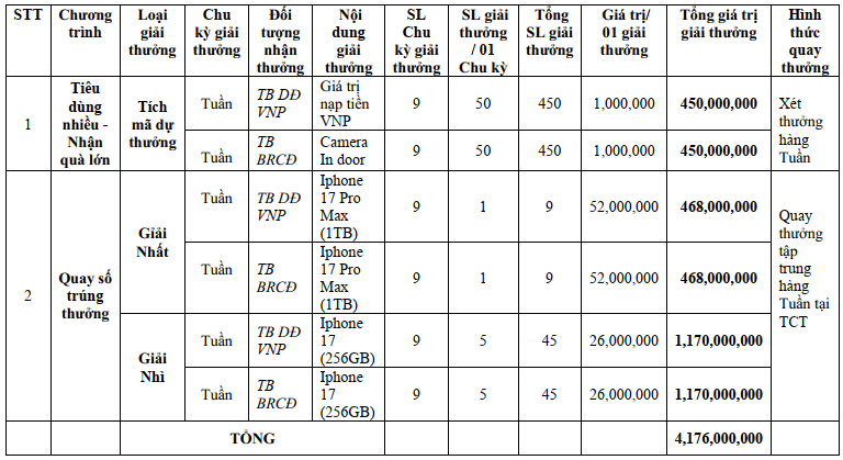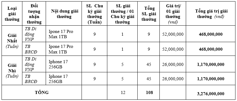 - Tổng giá trị giải thưởng: 3,276,000,000 đồng (Bằng chữ: Ba tỷ, hai trăm bảy mươi sáu triệu đồng chẵn, đã bao gồm thuế GTGT) - Giá trị giải thưởng đã bao gồm chi phí vận chuyển giải thưởng đến địa bàn các VNPT Tỉnh/thành phố. - Giá trị giải thưởng có thể điều chỉnh theo giá thực tế trên thị trường. - Giải thưởng không được quy đổi thành tiền mặt. - Ghi chú :(*) + Giải Tuần 1: Từ ngày 1/12/2025 đến hết ngày 7/12/2025 + Giải Tuần 2: Từ ngày 8/12/2025 đến hết ngày 14/12/2025 + Giải Tuần 3: Từ ngày 15/12/2025 đến hết ngày 21/12/2025 + Giải Tuần 4: Từ ngày 22/12/2025 đến hết ngày 28/12/2025 + Giải Tuần 5: Từ ngày 29/12/2025 đến hết ngày 4/1/2026 + Giải Tuần 6: Từ ngày 5/1/2026 đến hết ngày 11/1/2026 + Giải Tuần 7: Từ ngày 12/1/2026 đến hết ngày 18/1/2026 + Giải Tuần 8: Từ ngày 19/1/2026 đến hết ngày 25/1/2026 + Giải Tuần 9: Từ ngày 26/1/2026 đến hết ngày 1/2/2026 3. Nội dung chi tiết thể lệ chương trình khuyến mại 3.1 Điều kiện, cách thức, thủ tục tham gia chương trình khuyến mại - Trong thời gian khuyến mại, khách hàng thuộc đối tượng được hưởng khuyến mại khi đáp ứng điều kiện tham dự chương trình sẽ được VinaPhone gửi Mã dự thưởng (MDT) để tham gia chương trình quay số xác định trúng thưởng, cụ thể: + Khách hàng hoà mạng mới bundle/đăng ký gói cước di động VinaPhone trả trước/trả sau: ■ Cứ mỗi thuê bao di động hoà mạng mới đáp ứng điều kiện đăng ký gói được 01 MDT. Thời gian đăng ký gói cước tối đa trong vòng 7 ngày kể từ ngày TB kích hoạt HMM. ■ Cứ mỗi 50,000 đồng của gói cước bundle/đăng ký kèm theo thuê bao hoà mạng mới được nhận 01 MDT, không cộng dồn phần lẻ < 50,000 đ khi đăng ký nhiều gói. + Khách hàng là thuê bao di động hiện hữu VinaPhone trả trước/trả sau đang hoạt động đăng ký mới/gia hạn/nâng gói cước có phí từ 50,000 đ trở lên. Cứ mỗi 50,000đ của gói cước sẽ nhận 01 MDT, không cộng dồn phần lẻ < 50,000 đ khi đăng ký/gia hạn nhiều gói. + Khách hàng là thuê bao Băng rộng cố định (BRCĐ) sử dụng công nghệ XGSPON hoà mạng mới đăng ký gói 1G trở lên. ■ Cứ mỗi TB BRCĐ đăng ký sử dụng công nghệ XGSPON hoà mạng mới được nhận 01 MDT ■ Cứ 50,000đ doanh thu gói được nhận 01 MDT, không cộng dồn phần lẻ < 50,000đ. + Khách hàng là thuê bao BRCĐ hoà mạng mới thành công và thanh toán cước tối thiểu 03 tháng trở lên. ■ Cứ mỗi TB BRCĐ hoà mạng mới được nhận 01 MDT ■ Cứ 50,000đ doanh thu gói được nhận 01 MDT, không cộng dồn phần lẻ < 50,000đ. + Khách hàng là thuê bao BRCĐ hiện hữu chuyển đổi nâng sang gói có giá gói/tháng cao hơn, thanh toán tối thiểu 03 tháng trở lên. ■ Cứ 50,000đ doanh thu gói được nhận 01 MDT, không cộng dồn phần lẻ < 50,000đ. + Khách hàng là thuê bao BRCĐ hiện hữu chuyển đổi sử dụng công nghệ XGSPON, tích hợp thêm các dịch vụ khác (MyTV, Mesh, Cam, …). ■ Cứ mỗi TB chuyển đổi được nhận 01 MDT 3.2 Thời gian, cách thức phát hành bằng chứng xác định trúng thưởng: - Thuê bao di động VinaPhone, thuê bao sử dụng dịch vụ BRCĐ sau khi đáp ứng được các điều kiện của chương trình sẽ được nhận Mã dự Thưởng (MDT) bằng tin nhắn của VinaPhone (Brandname tin nhắn: VinaPhone) hoặc tra cứu trên website https://khuyenmai.vinaphone.com.vn/ - MDT được gửi đến Thuê bao di động VinaPhone, Thuê bao sử dụng dịch vụ băng rộng cố định của VNPT (có số liên hệ là thuê bao di động VinaPhone) qua SMS (Brandname: VinaPhone). - Thời gian gửi MDT đến khách hàng là vào ngày liền sau ngày thuê bao đáp ứng tiêu chí của chương trình. - Nội dung tin nhắn thông báo MDT như sau: