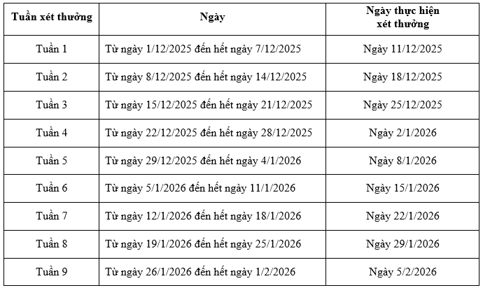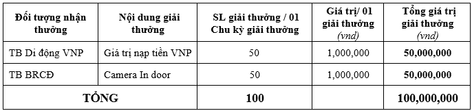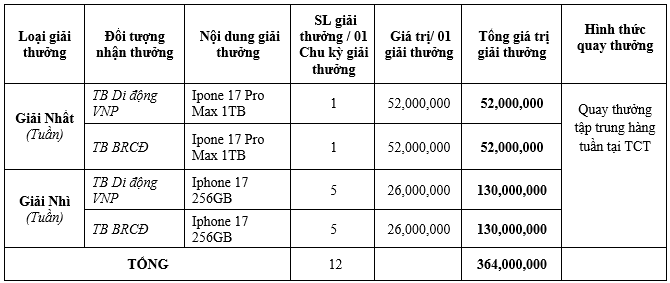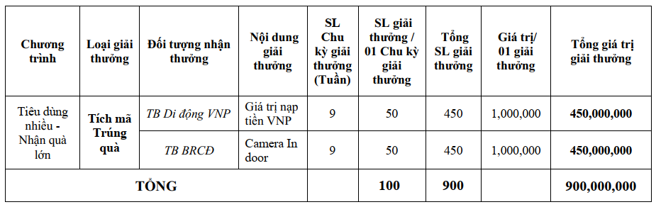 - Tổng giá trị giải thưởng: 900,000,000 đồng (Bằng chữ: Chín trăm triệu đồng chẵn, đã bao gồm thuế GTGT) - Giá trị giải thưởng có thể điều chỉnh theo giá thực tế trên thị trường. 3. Tiêu chí xét thưởng: ➤ Đối với TB di động VNP: - Mỗi tuần xét 50 Thuê bao di động VNP có số lượng MDT cao nhất của Tuần đó được nhận thưởng. - Trường hợp trong Tuần xét thưởng có nhiều hơn 01 thuê bao có số lượng MDT cao nhất bằng nhau thuộc đối tượng được nhận thưởng thì xét ưu tiên Thuê bao có thời điểm phát sinh doanh thu tạo MDT sớm nhất trong tuần đó. Trường hợp có trên 01 thuê bao có cùng các thông số trên sẽ ưu tiên thuê bao có ARPU tiêu dùng tháng 11.2025 cao nhất. ➤ Đối với TB BRCĐ: - Mỗi tuần xét 50 Thuê bao di động BRCĐ có số lượng MDT cao nhất của Tuần đó cao nhất được nhận thưởng. - Trường hợp trong Tuần xét thưởng có nhiều hơn 01 thuê bao có số lượng MDT cao nhất bằng nhau thuộc đối tượng được nhận thưởng thì xét ưu tiên về thời gian thanh toán của khách hàng (Mã hợp đồng nào được thanh toán sớm nhất trong Tuần đó). 4. Thời gian xét thưởng: - Xét thưởng hàng Tuần: MDT được tham gia xét thưởng Tuần là các MDT được phát sinh từ 0h ngày đầu tiên của Tuần đến 24h ngày cuối cùng của Tuần đó, cụ thể: