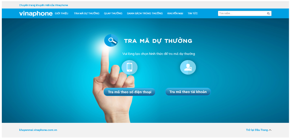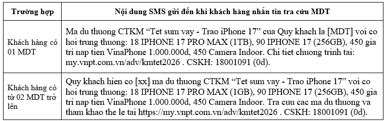 - Tra cứu chi tiết mã dự thưởng: Khách hàng có thể thực hiện tra cứu mã dự thưởng bằng tin nhắn hoặc tra cứu trên website khuyến mại của chương trình. ■ Tra cứu bằng tin nhắn: Với khách hàng sử dụng dịch vụ di động VinaPhone, khách hàng sử dụng dịch vụ băng rộng cố định của VNPT có số liên hệ là di động VinaPhone: Để tra cứu số mã dự thưởng mình có, khách hàng soạn tin nhắn MDT gửi đến 1558 (miễn phí tin nhắn, chỉ nhắn với khách hàng thuê bao di động VinaPhone), chương trình sẽ gửi tin nhắn đến máy khách hàng.