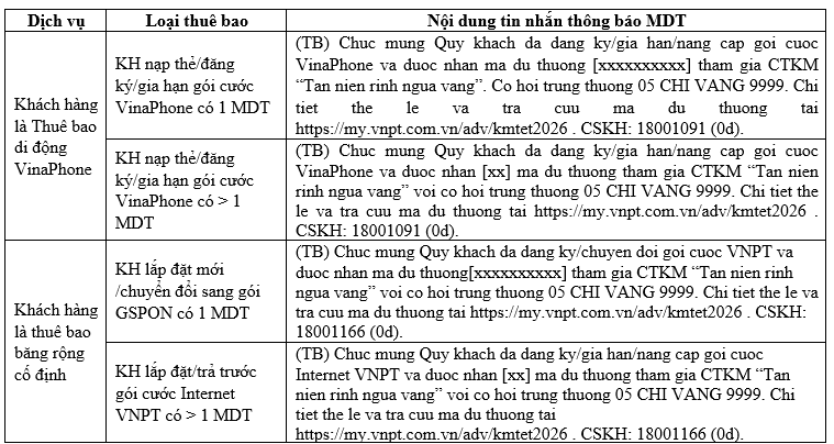 ■ Nội dung tin nhắn phản hồi: Thuê bao của quý khách thuộc 8.3 Quy định về bằng chứng xác định trúng thưởng: - Mã dự thưởng (MDT) được sử dụng để quay số trúng thưởng các giải trong chương trình. Mỗi MDT bao gồm 11 ký tự là số tự nhiên ngẫu nhiên. (phần MDT không đủ 11 ký tự, sẽ bù thêm số 0 bên trái sao cho đủ 11 ký tự). - 01 Mã dự thưởng chỉ được quay thưởng 01 lần và trúng tối đa 01 giải thưởng. - Tổng số mã dự thưởng dự tính phát hành trong thời gian khuyến mại: dự kiến 270 triệu MDT. 8.4 Quy định về bằng chứng xác định trúng thưởng: - Tổng Công ty Dịch vụ Viễn thông xác định trúng thưởng cho Khách hàng bằng phần mềm do VNPT phát triển dựa trên số lượng mã số tham dự hợp lệ của khách hàng trong thời gian khuyến mại. - Thực hiện quay thưởng theo mã dự thưởng cung cấp cho khách hàng. - Cách thức xác định trúng thưởng: Kết thúc chương trình, toàn bộ MDT được tham gia quay thưởng xác định các giải thưởng theo chi tiết cơ cấu giải thưởng của chương trình: