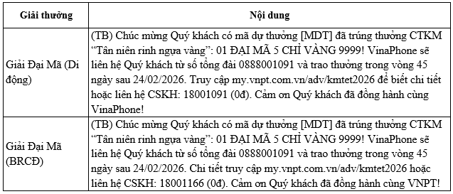 - Danh sách các thuê bao trúng thưởng được đăng tải trên website của chương trình tại https://khuyenmai.vinaphone.com.vn/, đồng thời thông báo bằng cuộc gọi của nhân viên VNPT VinaPhone (đối với tất cả các thuê bao trúng thưởng) và tin nhắn thông báo trúng thưởng đối với khách hàng trúng thưởng có sử dụng số liên hệ là thuê bao mạng VinaPhone.